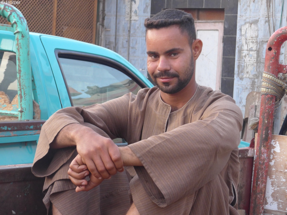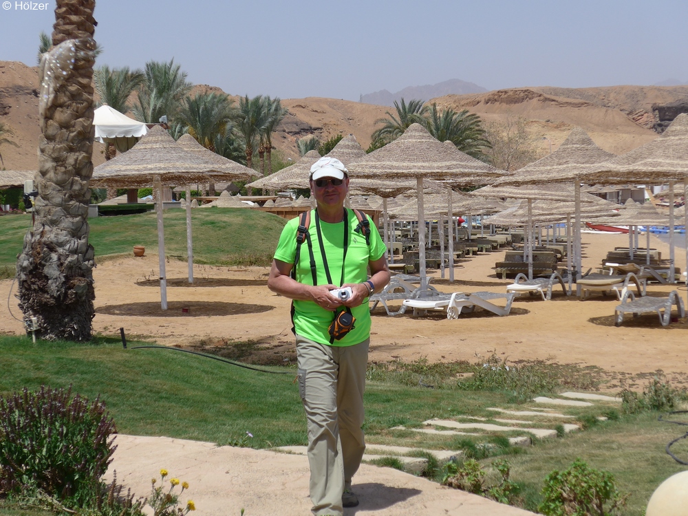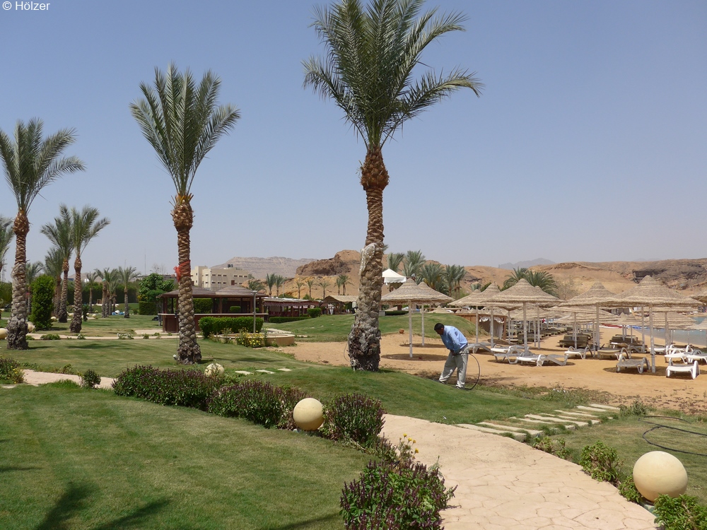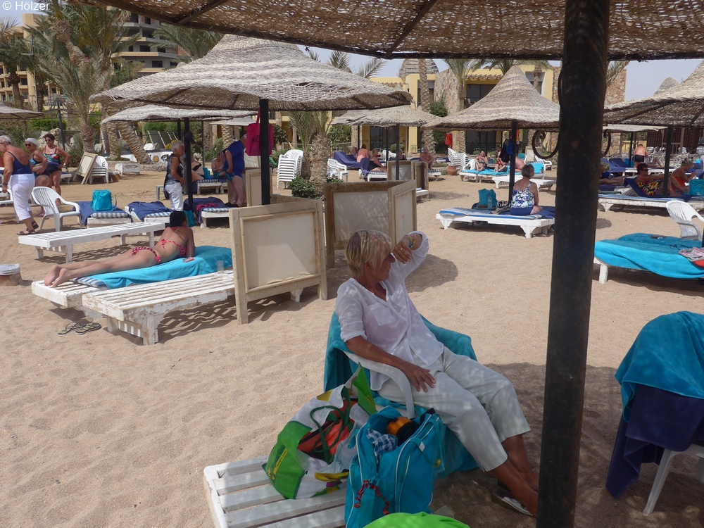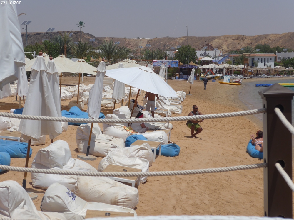 Am Strandabschnitt mit den leeren Liegen kamen wir auf mit einem Ägypter ins Gespräch, der, wie sich herausstellte, diesen Strand nebst Liegen und Sonnenschirme betrieb. Auf unsere Frage, warum keine Gäste zu sehen, antwortete er, dass diese im Laufe des Vormittags noch kommen würden. Hotels, die keinen eigenen hätten, würden ihre Gäste mit Bussen hierhierbringen.