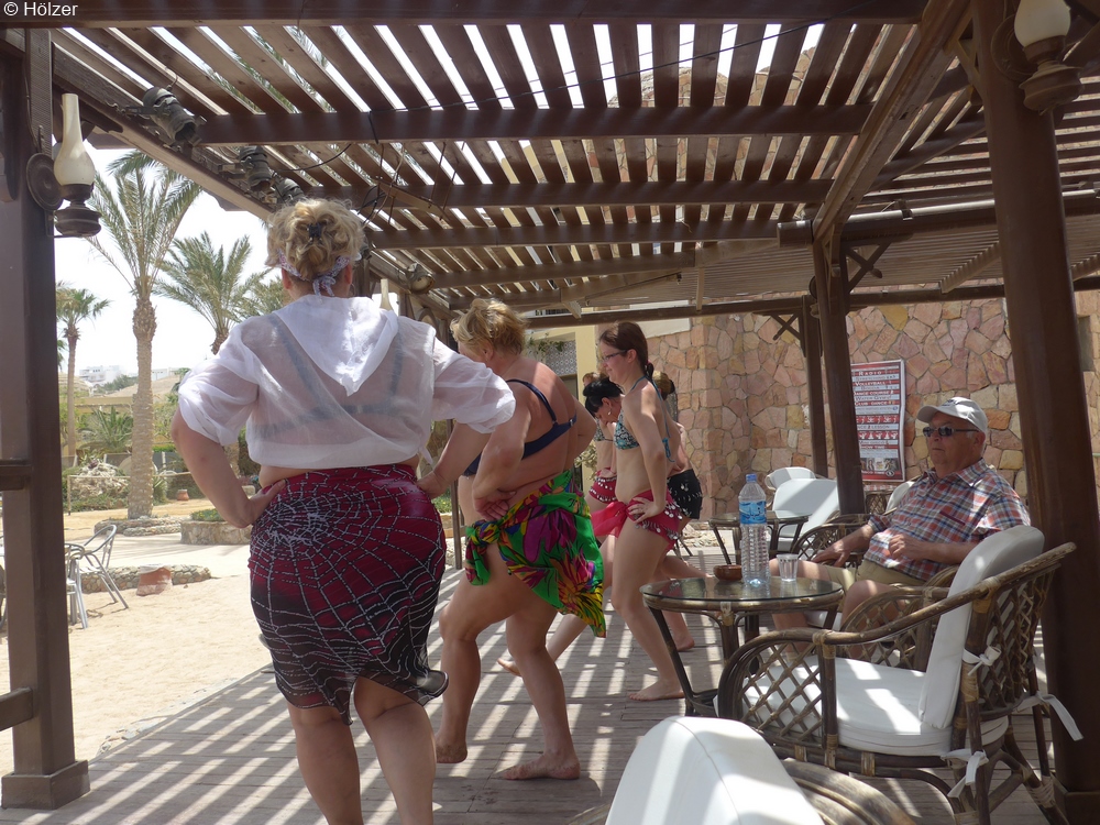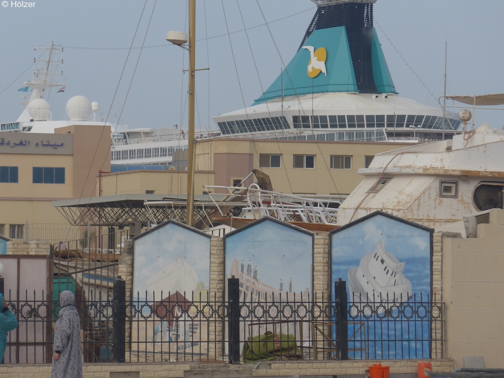 Der für heute gebuchte vierstündige Badeausflug ging um 8.40 Uhr los, was bedeutete, eine halbe Stunde früher aufzustehen. Der Bus fuhr brauchte etwa 10 Minuten, um uns vom Hafen in das Ressort „Juwels Sahara“ zu fahren. Diese kurze Fahrt war recht aufschlussreich, wie es um die Tourismusbranche in Ägypten steht, nämlich sehr schlecht. Man sah jede etliche Bauruinen oder ehemalige Hotels, die geschlossen und dem verfall preisgegeben sind. Etwas abgenutzt