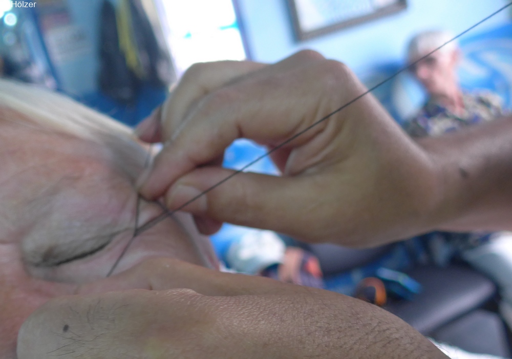 Interessant war ein uns bisher völlig unbekannte Methode, Gesichtshaare (Flaumhärchen, nicht Barthaare) mit Hilfe eines Fadens zu entfernen. Dazu wurde man erst mit einem weißen Pulver bestäubt und dann legte er los. Das zwirbelte recht ordentlich, Genuss geht anders.