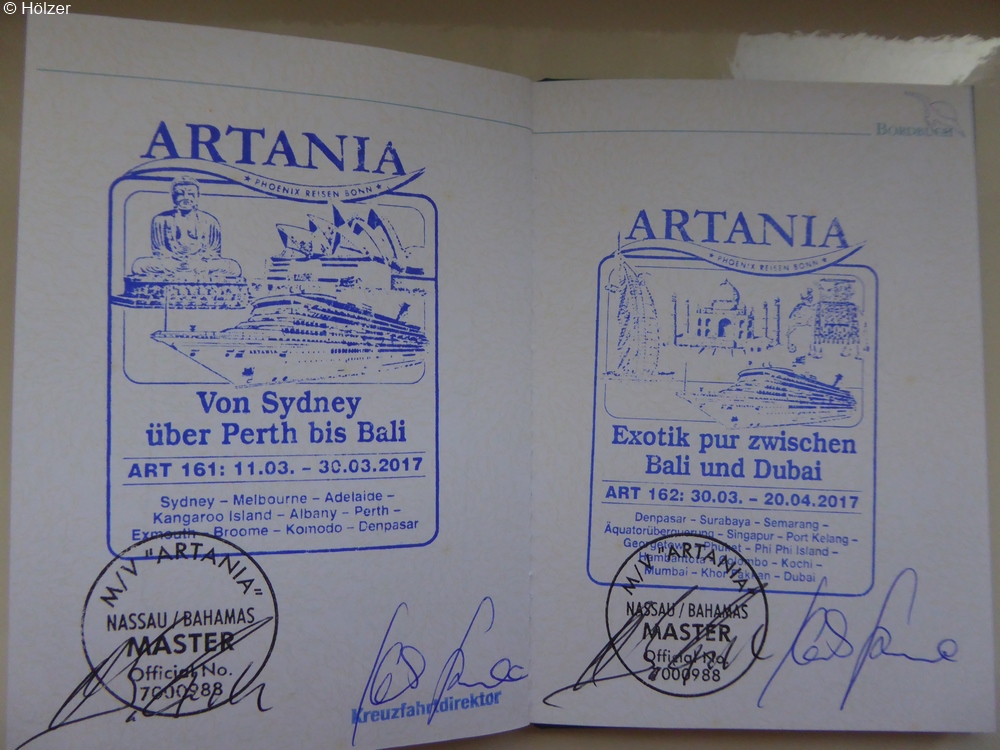 Außerdem haben wir unser Bordbuch zurückbekommen. Ein Bordbuch ist ein einem Reisepass nachempfundenes Büchlein, in das die Reiseleitung jede Kreuzfahrt bzw. jede Etappe per Stempel oder Aufkleber „dokumentiert“ und mit Unterschrift vom Kapitän und Kreuzfahrtdirektor versehen lässt.