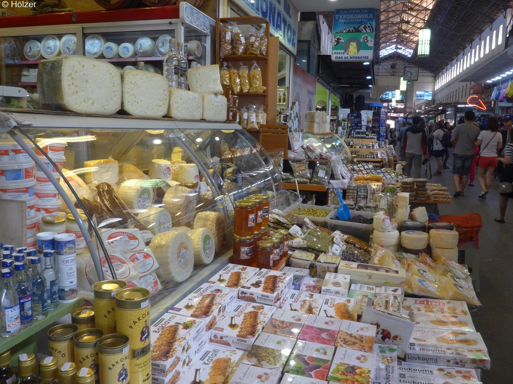 Angeboten werden hier Schafs- und Ziegenkäse, Olivenöl, Seifen. Lederwaren und Souvenirartikel, ein Angebot, das sich weitestgehend an die Touristen richten, vielleicht mit Ausnahme der Frischfleischhändler.