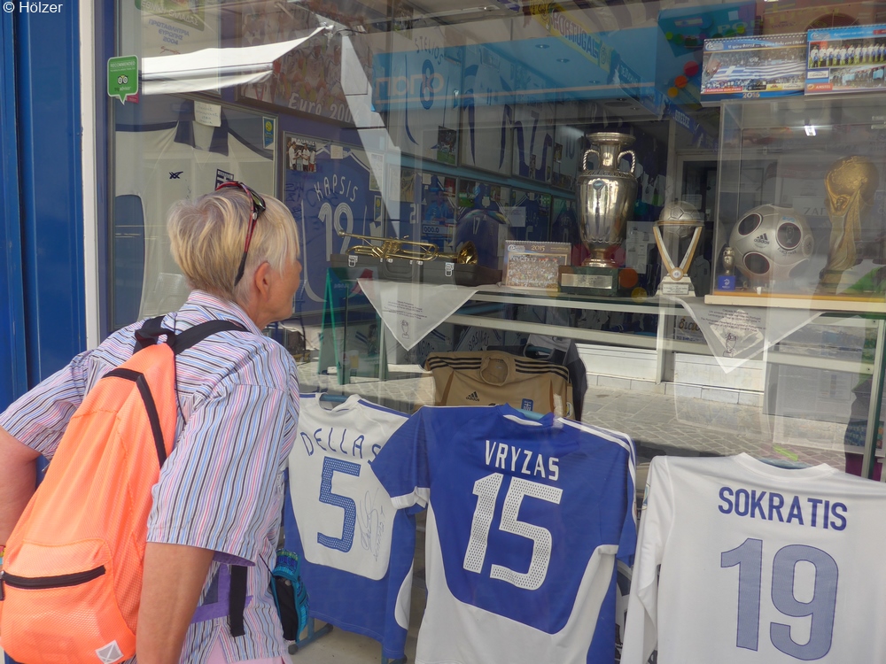Auf unserem Weg zum nahegelegenen alten Hafen, der als Yachthafen und Hafen für Ausflugsboote genutzt wird, kamen wir an einem Sportgeschäft vorbei, in dessen Schaufenster eine Kopie des Pokals für die Fußball-Europameisterschaft, die die Griechen ja 2004 gewonnen hatten (1:0 gegen Portugal; Trainer Otto Rehhagel!).
