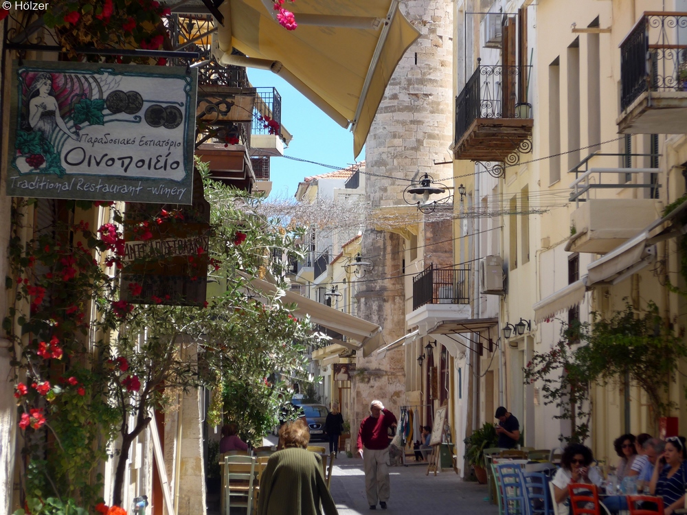 Über den Rest unserer Tour durch Chania gibt es nicht viel zu berichten. Das Gebiet zwischen Markthalle und altem Hafen ist weitgehend touristisch geprägt, das heißt viele Geschäft e mit den Urlaubern und Tagesbesuchern als Zielgruppe. Die Häufung dieser Geschäfte ist durchaus ähnlich den Basaren, die wir z. B. in Dubai oder Salalah besucht hatten.
