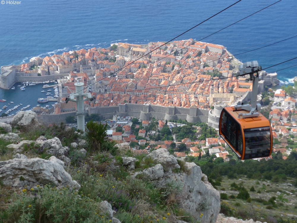 Mehr durch Zufall entdeckten wir an der nördlichen Stadtmauer die Verkaufsstelle für die Tickets der Gondelbahn. Die Talstation befindet sich außerhalb der historischen Stadtmauer und war in wenigen Minuten erreicht. Nach knapp 5 Minuten waren wir oben auf der Bergstation und hatten eine tolle Sicht auf die Stadt.