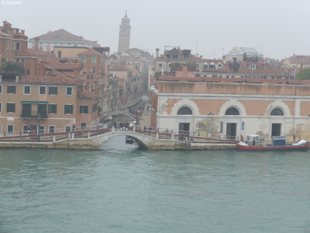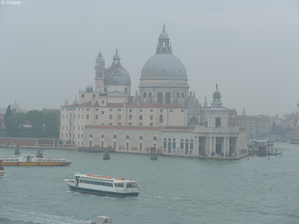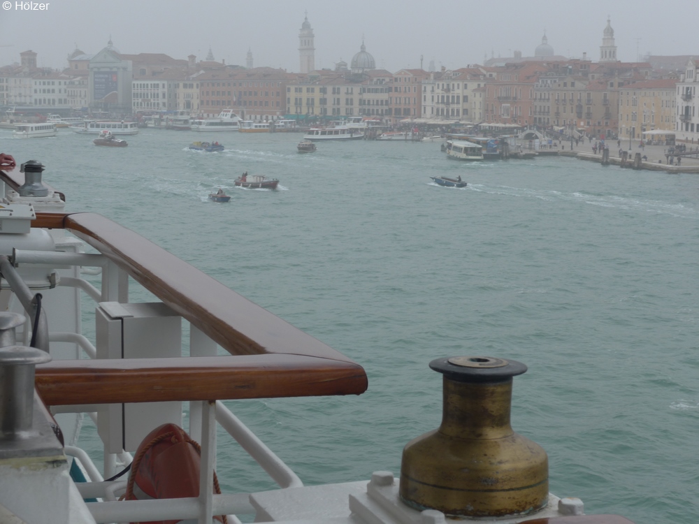 Noch während des Frühstücks meldete sich unser Kreuzfahrtdirektor über Bordlautsprecher, das wegen des starken Nebels der Hafen von Venedig gesperrt ist. Wir mussten also erst einmal ankern und warten bis sich der gelegt hatte. Mit knapp zweistündiger Verspätung liefen wir in den Canale Grande ein. Der Restnebel sorgte dafür, dass die Freude der Fotografen an den Motiven wie Seufzerbrücke oder Markusdom im wahrsten Sinne des Wortes getrübt war.