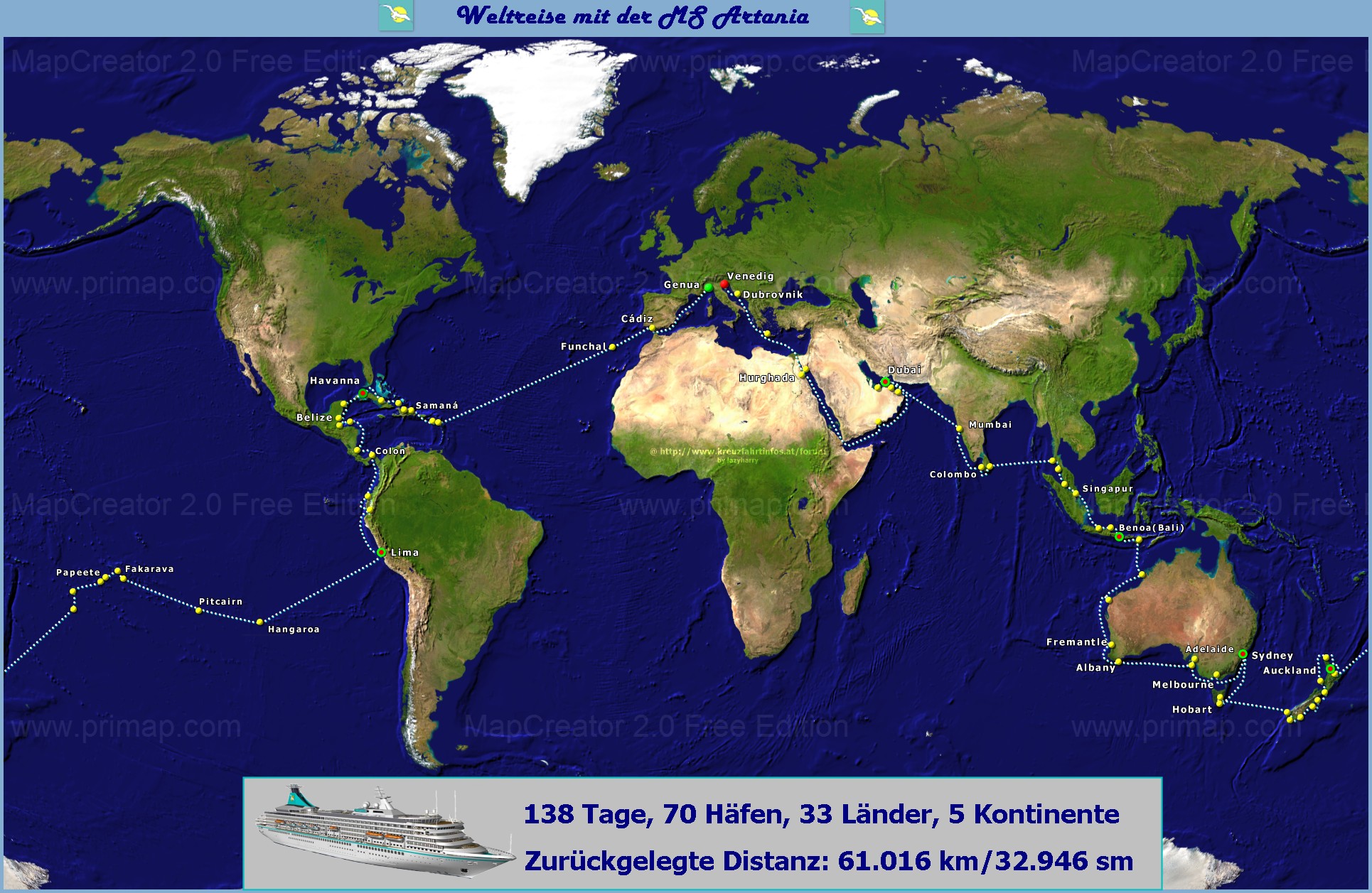 Zur Reiseroute haben Mitglieder des Internetportals http://www.kreuzfahrtinfos.at/forum/ für mich wunderschöne Routenkarten für die einzelnen Etappen angefertigt. Ein Blick in die Menüpunkte unter "Route und Schiff", insbesondere der Unterpunkt "Die Route" ist durchaus lohnenswert.