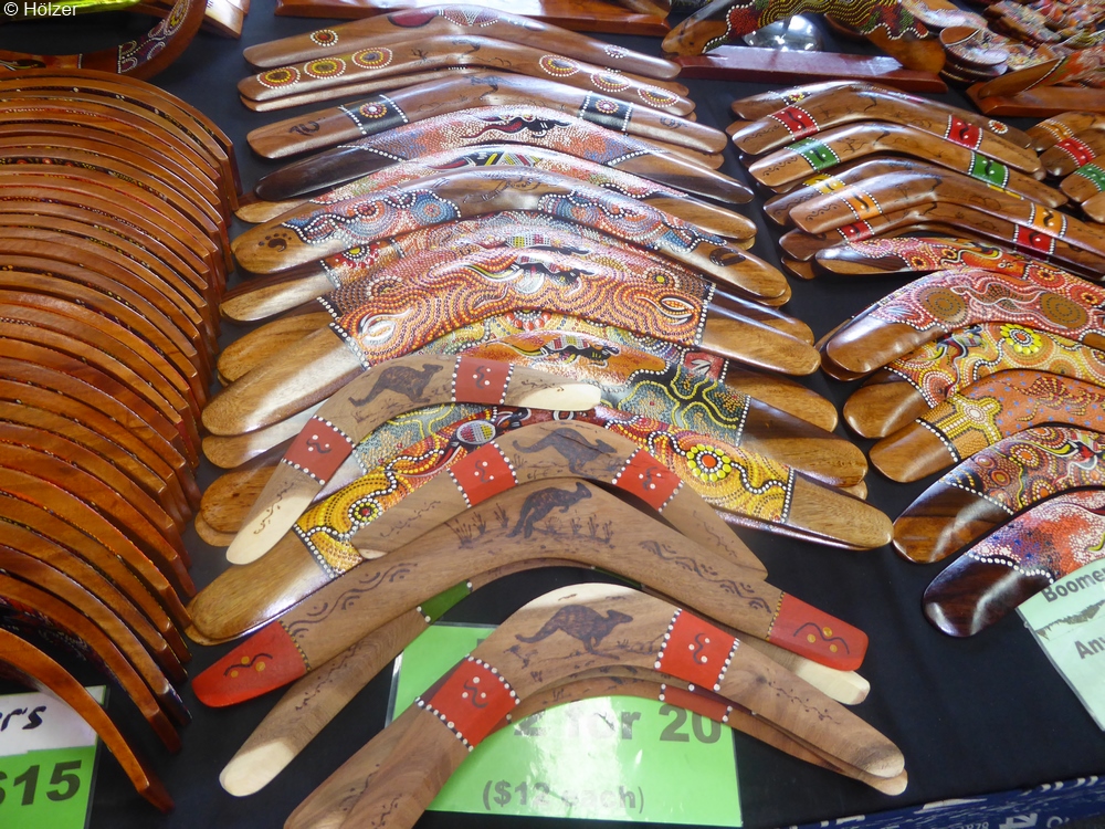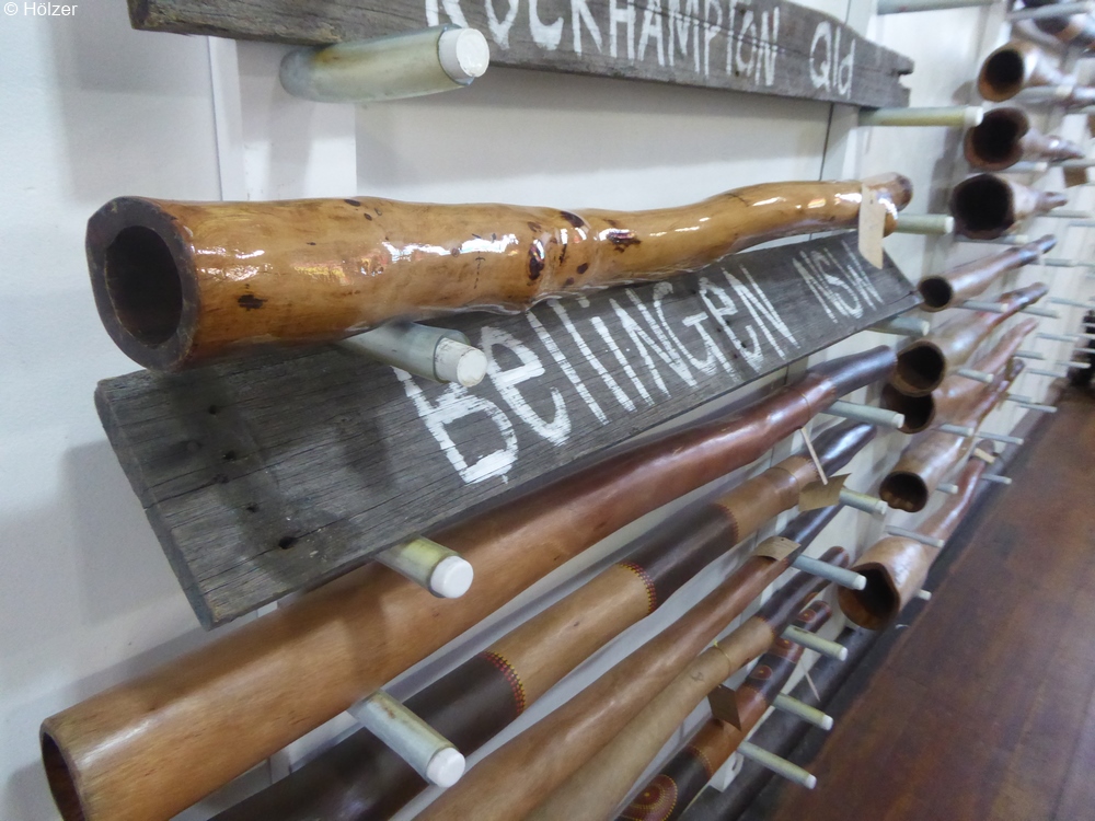 Auf dem Rückweg zum Schiff kamen wir noch an einem Laden vorbei, in dem echte Didgeridoos verkauft wurden. Dieses Instrument, wurde ursprünglich von den Aborigines verwendet. In den meisten Andenkenläden kann man farbenfrohe industriell hergestellte Didgeridoos kaufen, aber diese hier wurden noch handwerklich nach den alten Techniken, nämlich einem 1 - 2,50 Meter langen Eukalyptusstamm, der von Termiten ausgehöhlt wurde, angefertigt.