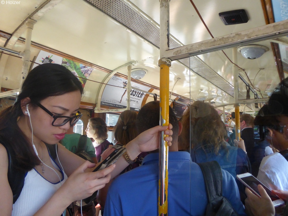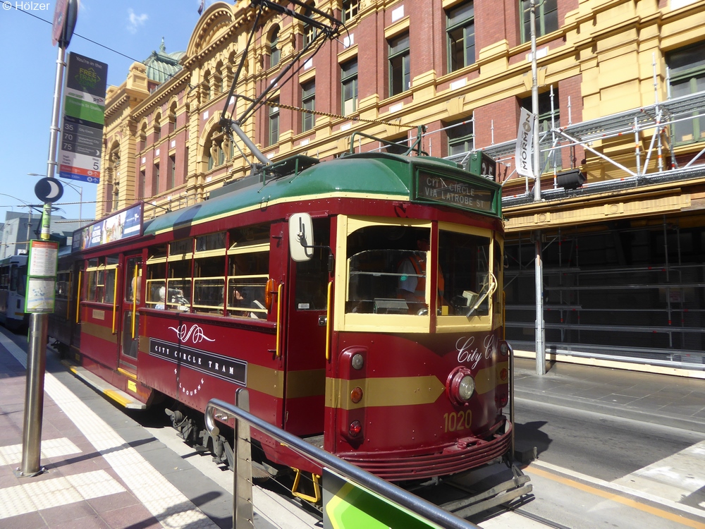 Auf einem Rundkurs um die City verkehrte eine (natürlich kostenlose) historische Straßenbahn, mit der wir auch fahren wollten. Das wollten unzählige andere Touristen aber auch. So fuhren wir in einer heillos überfüllten Bahn in die Flinders Street am Ufer des Yarra River. Sightseeing funktionierte während der Fahrt nicht so richtig, aber die Informationen vom Band verrieten wenigstens, was man hätte sehen können.