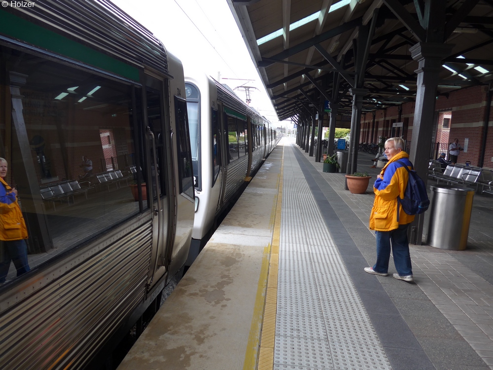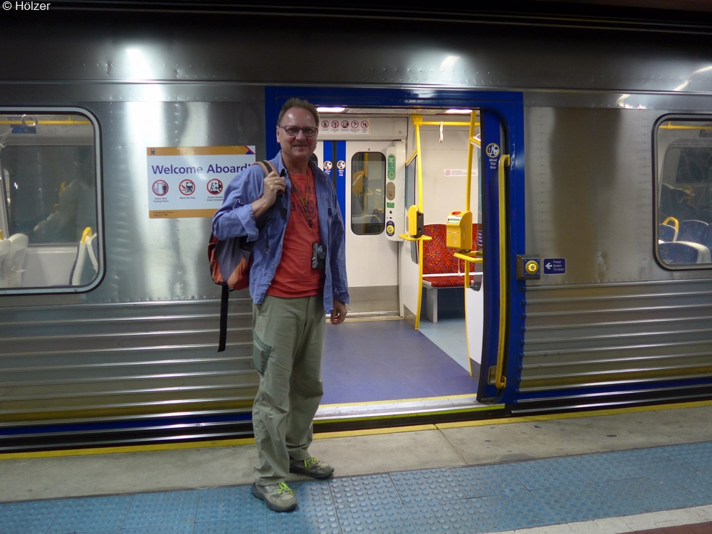 Unsere Rechnung ging auf und wir fuhren in einem halbleeren Zug in einer 40-minütigen Fahrt nach Adelaide Central Station. Die Hinfahrt war einfach. Vom Hafen fuhr nur eine Linie hierher, da kann man nichts falsch machen. Bei der Rückfahrt musste man dann schon etwas aufpassen, den richtigen Zug zu erwischen. Als wir uns dementsprechend versuchten schlau zu machen, kam unaufgefordert ein Bediensteter auf uns zu, erkannte sofort unsere Absicht und zeigte uns wo die Tafel mit den „Departures“, den abfahrenden Zügen zu finden ist. Toller Service!