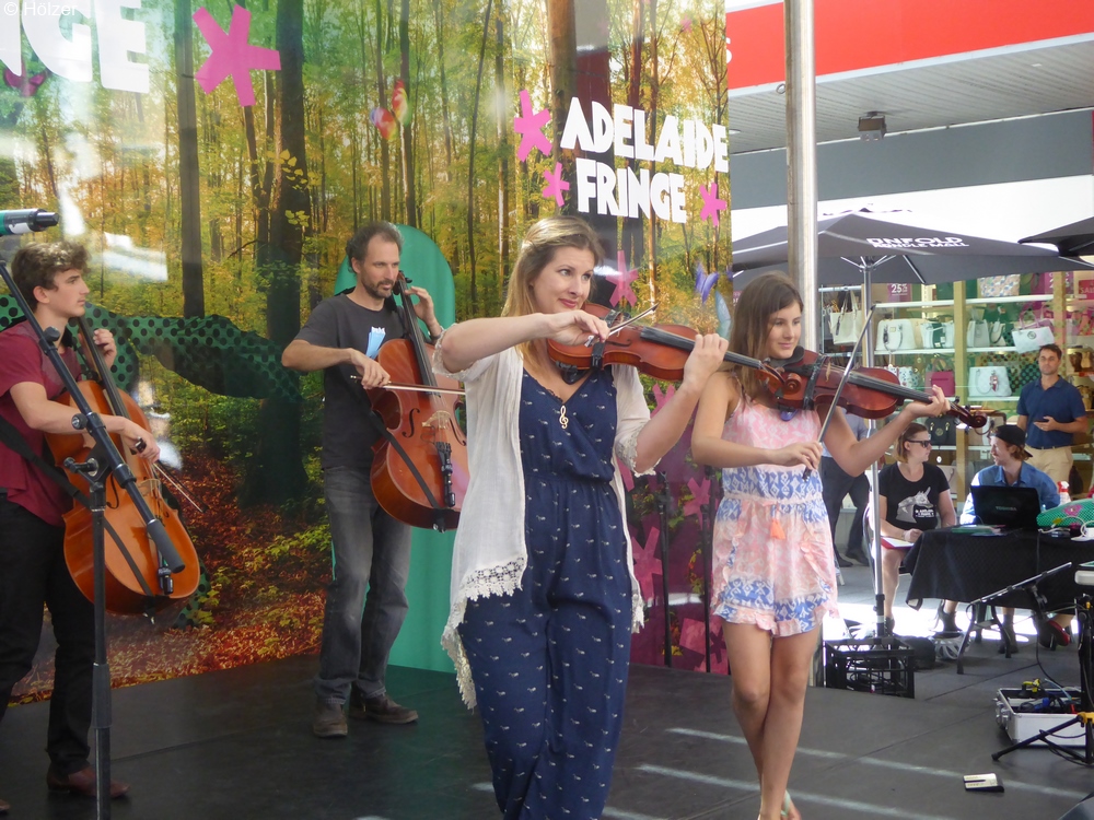 Vorbei am alten und neuen Parlamentsgebäude bogen wir ab in die Rundle Mall, eine belebte Fußgängerzone. Im Rahmen eines Kleinkunstfestivals war auch hier eine kleine Bühne aufgebaut, auf der sich diverse Künstler im 15-Minuten-Takt präsentieren konnten.