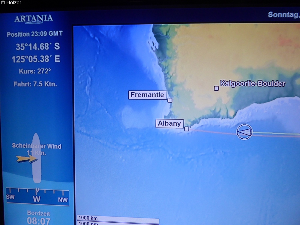 Im Kanal 1 des Bordfernsehens, wo die sogenannte Cruise-Show läuft, das eine Anzeigenfolge von Positions, Geschwindigkeits und Wetterdaten, konnte man sehen, dass die Artania nur noch mit halber Kraft lief. Statt wie mit 16 - 19 Knoten (ca. 28 - 34 km/h), fuhren wir nur noch etwa 7 Knoten.