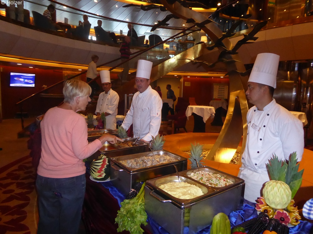 Heute stand auch noch der Galaabend auf dem Programm, die sogenannte Mittelgala. (Die Begrüßungsgala hatten wir schon, die Abschiedsgala wird noch folgen.) Also binde ich mit brav meine Krawatte um, bevor ich mit Doris zum Abendessen ins Selbstbedienungsrestaurant Lido schreite.