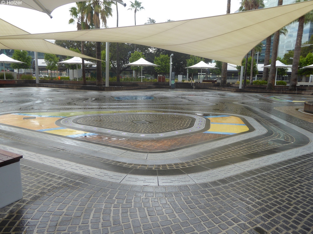 Hier wären normalerweise Wasserfontänen aus dem Boden gekommen. Aber Dienstags (und heute war Dienstag) ist immer wegen Wartungsarbeiten das Wasserspiel außer Betrieb. Aber wir hatten ja auch Wasserspiele von oben zur genüge, da konnten wir die fehlenden von unten leicht verschmerzen.