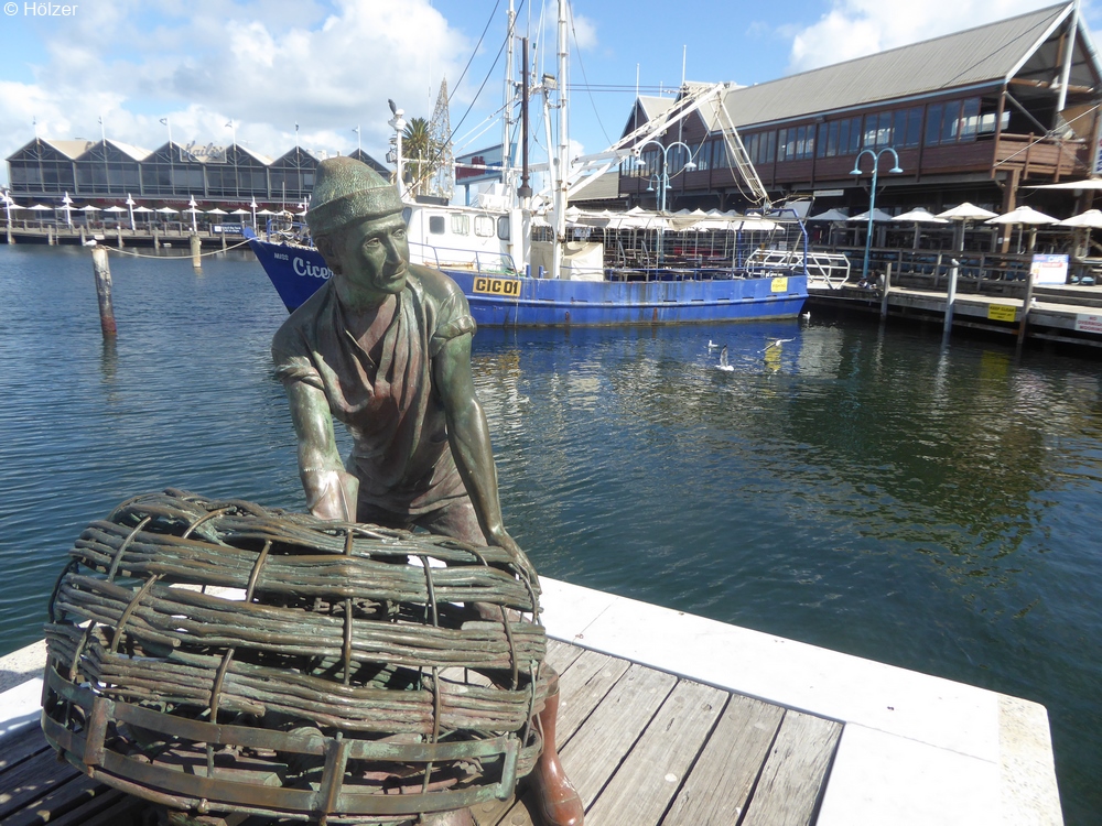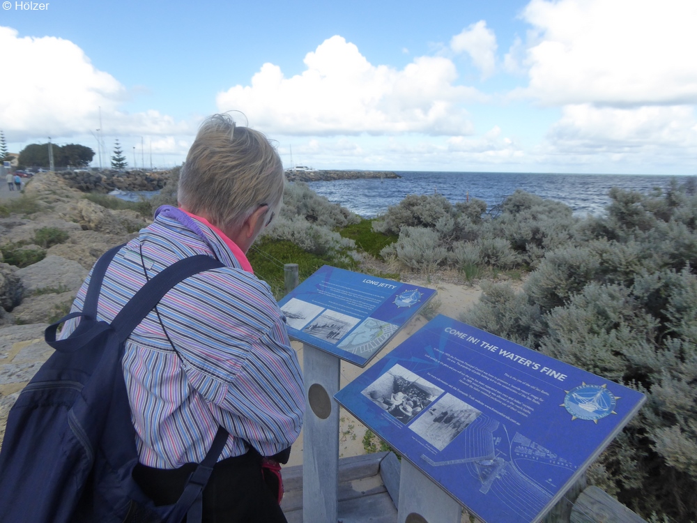 Zunächst steuerten wir den Fischereihafen an. Er wird mittlerweile hauptsächlich touristisch genutzt. Allerdings ist die Saison schon vorbei, die vielen hübschen lokale, auf Pfeilern ins Wasser gebaut waren ohne Besucher oder ohnehin geschlossen. Auf dem Weg passierten wir das Round House, dass im Reiseführer als „das älteste erhaltene Gebäude in Western Australia, das 1830/1831 als Gefängnis errichtet wurde.“ hervorgehoben wird.