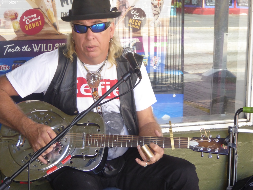 Diese Aluminium-Gitarre nennt sich Dobro, die durch den metallenen Korpous einen ganz besonderen Klang hat. Der Straßenmusiker hier im Cappuccino Strip spielt sie mit der sogenannten Bottleneck-Technik. Er greift nicht nur Akkorde, sondern er zieht auch mit dem Metallröhrchen, dem Bottleneck (Flaschenhals), den er über den Mittelfinger gestülpt hat, über die Saiten und erzeugt so eine „wimmernde“ Tonfolge. Diese Technik wird oft beim Blues verwendet und dieser Knabe hier spielte waschechten Blues.